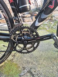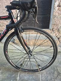 La bici monta un telaio in alluminio taglia M per altezze tra 1.65 a 1.75, con forcella in carbonio. Ha un cambio campagnolo a 9 velocità.
