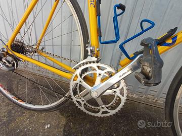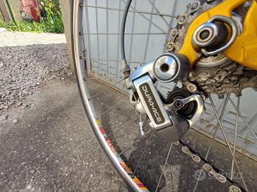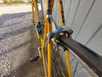 Vendo splendida bicicletta da corsa Viner modello Comp Line, risalente alla metà degli anni '90, pezzo da collezione perfettamente conservato e pronto all'uso. Il telaio è in acciaio di alta qualità, nel classico colore giallo Viner dell'epoca. Specifiche Tecniche: Gruppo completo: Shimano Dura-Ace 8 velocità (serie 7400), un'icona del ciclismo vintage. Comandi Cambio: integrati nelle leve freno Shimano STI (Dura-Ace 7400). Guarnitura: doppia corona (52 denti, corona grande Stronglight) e deragliatore Dura-Ace. Freni e Mozzi: tutti Dura-Ace originali e lucidi. Ruote: Cerchi FIR EA50 in alluminio su mozzi Dura-Ace. Attacco Manubrio: 3TTT. Misure Telaio: 52x53 La bici è stata acquistata usata nel 2004 ed è sempre stata tenuta al coperto e curata. Le condizioni estetiche e funzionali sono ottime. Disponibile per qualsiasi visione e prova.