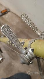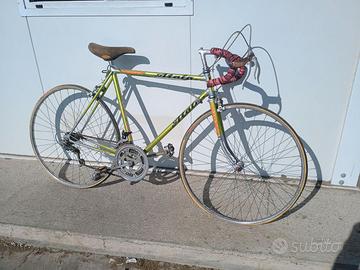 Bici da Corsa Vintage Atala-Kustle Vendo bici da corsa d’epoca Atala Kustle, telaio in acciaio verde bottiglia, leggera e perfetta per restauro o uso urbano rétro. Caratteristiche Tecniche •Telaio acciaio Atala Kustle (misura da verificare, stimata 54–56 cm) •Freni a pattino Balilla (anteriore e posteriore) •Leve cambio Campagnolo sul tubo obliquo •Cambio posteriore Shimano SIS •Deragliatore anteriore Lepper •Sella Laser by San Marco, inclinazione regolabile •Cerchi a raggi con copertoni da strada (gomme da sostituire) •Manubrio avvolto in nastro rosso/nero •Pedali metallici vintage •Dadi ruote a farfalla per smontaggio rapido •Bicicletta estremamente leggera e solida Condizioni •Strutturalmente integra, con componenti originali •Freni e trasmissione funzionanti, necessitano pulizia e taratura •Gomme da sostituire Dettagli e Prezzo •Prezzo: 200 € •Ritiro a mano: