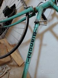 Vendo bicicletta da corsa vintage Bianchi, telaio in acciaio con il classico colore celeste originale. Cambio a leve sul tubo obliquo, manubrio da corsa con nastro, freni tradizionali.