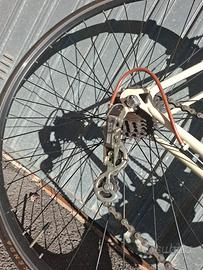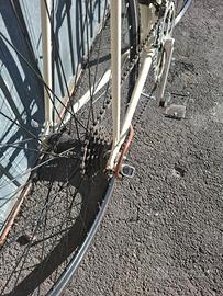 Vendo bici da corsa anni 90 Chiorda, copertoni, cerchi, cambio, sella, portaborraccia, leve del cambio e tubi passacavi e cavi freni e cambio sono nuovi, freni, leve freno, sterzo e pedali sono originali, 5 corone posteriori e doppia corona sui pedali. Perfettamente funzionante. Disponibili anche i supporti per i pedali con le cinghie in cuoio originali dell'epoca.