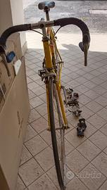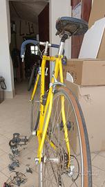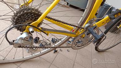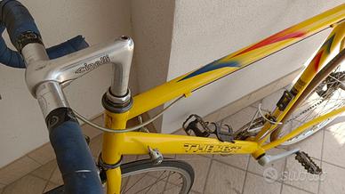 Bicicletta da corsa dei primi anni 00, made in Italy, 21 marce, cambio Shimano, ruote con camera d'aria e ulteriori accessori la cui funzionalità è da verificare (freni di ricambio, computer, fermapiedi), usata poco ma perfettamente funzionante. Manca la pompa. Vendo per inutilizzo.