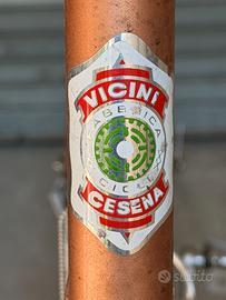 Vendo splendida bicicletta da corsa d’epoca marca Vicini, originale del 1973. Un pezzo di storia del ciclismo italiano, perfetto per appassionati del vintage o per partecipare a ciclostoriche come l’Eroica. La bici presenta la sua caratteristica colorazione ramata/arancio, tipica del marchio, con telaio in acciaio di alta qualità e congiunzioni curate. Dettagli Tecnici: Anno: 1973 Telaio: Acciaio con tubazioni leggere Gruppo Cambio: Campagnolo originale dell'epoca Stato: Ottimamente conservata con vernice originale, un po' impolverata. Componenti: Sella d'epoca, manubrio a piega corsa con nastro nero, cerchi per tubolari. La bicicletta è pronta all'uso o ideale come pezzo da esposizione. Viste le dimensioni non spedisco, ritiro a domicilio in zona Pianello Vallesina