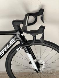 Bici allestita con un gruppo completo Shimano Ultegra di2 12v, ruote Whistle in carbonio con profilo da 35 e manubrio Whistle monoscocca in carbonio