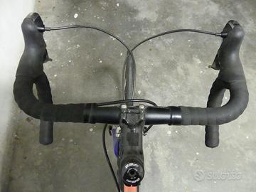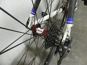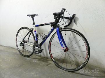Bici da corsa Wilier Triestina Lampre edition, telaio allumino; foderi posteriori, reggisella Ritchey e attacco manubrio Fsa in carbonio. Cambio Shimano Ultegra 10v, freni Shimano Dura Ace, ruote Miche, copertoncini Michelin Pro 3 Race. Taglia XS (Altezza ciclista: c.a. 165 cm). Reach: 38 cm; Stack: 52; Distanza centro mozzo anteriore/centro mozzo posteriore: 97 cm.