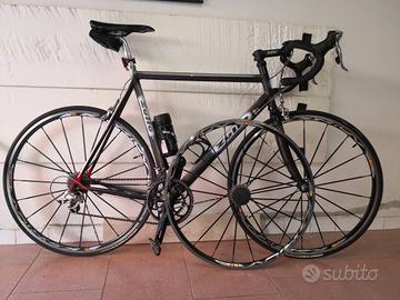Vendo bicicletta da strada a 9 velocità marca Zullo, telaio 57x57 in alluminio con forcella e parti della sella in carbonio, guarnitura shimano 105, ruote ksyrium, corone compact 50-34, pacco pignoni 13/26. Prezzo leggermente trattabile in quanto regalo seconda ruota posteriore ksyrium con pacco pignoni 12/22 e le sue ruote originali (normali ruote in allumnio ma usate praticamente pochissimo) con pacco pignoni 13/28, coppia di ruote in allumnio a profilo alto (la posteriore senza pacco pignoni), e le corone anteriori che completavano la guarnitura.