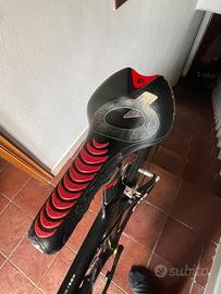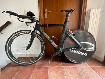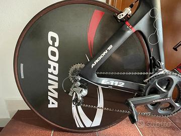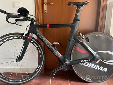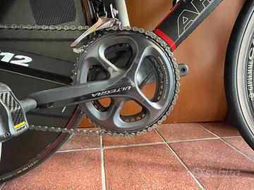 Bici da cronometro/triathlon, telaio Argon18 e112 msura L (175-185cm). Gruppo Shimano 105 11v, pacco pignoni 11/28, guarnitura Ultegra 53/39. Freni sram, cockpit Zipp in alluminio, ruota posteriore lenticolare Corima, ruota anteriore Gipiemme 55mm, profilo in alluminio, sella Prolgo Nago TTR, pedali Look Keo Blade.