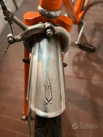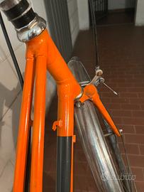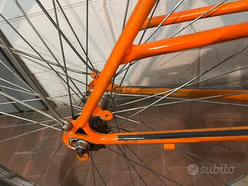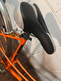 Bicicletta vintage unisex o da donna di colore arancione, recentemente restaurata. Ideale per spostamenti urbani e passeggiate. - Telaio in metallo. - Sella nera imbottita nuova - Manubrio con impugnature scure. - Ruote con copertoni neri buoni. - Parafanghi anteriori e posteriori in metallo lucidato - fanale anteriore funzionante - pedali originali non restaurati un po’ consumati Splendida! Non ho ancora messo la catena. Con 10€ extra la metto