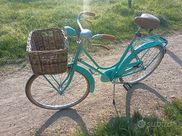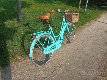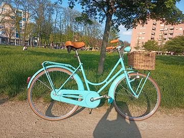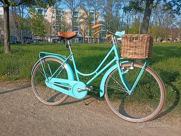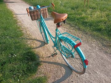 Vendo bici da donna color Ciano con freni a bacchetta pantografati Mauri per persone alte da 1,60 a 1,80 La bici ha non più di 3 anni di vita ed è stata usata veramente poco, esteticamente e meccanicamente si rifà ai modelli classici di bici da donna con freni a bacchetta, molto elegante e signorile, montata con: Manubrio pantografato 2m, portapacchi anteriore e posteriore co nolla portapacchi, cestino anteriore in vimini molto capiente (40x30 centimetri), parafanghi corazzati anteriore e posteriore (hanno le gonne laterali e proteggono di più) completamente in metallo, sella ammortizzata marrone come le manopole, luci anteriori e posteriori a dinamo funzionanti con gemma catarifrangente, campanello bitono (fa din don). La bici è praticamente nuova, ha qualche leggero graffio impercettibile ma per il resto è perfetta meccanicamente e esteticamente. Pronta da usare fin da subito, nessun lavoro da fare. disponibile a farla provare.