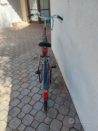 Bici da donna che necessita di ripararazioni, di colore rosso scuro e con portapacchi anteriore e posteriore, dotata di lucchetto antifurto con combinazione. Vendesi per inutilizzo.