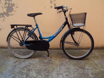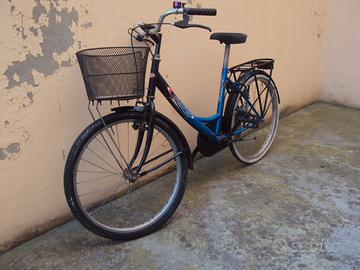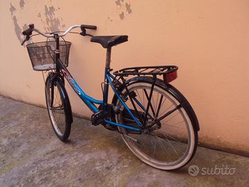 Bici da donna B4Bike blu e nera con ruote da 24'. Con portapacchi posteriore, cestino, campanello e cavalletto.