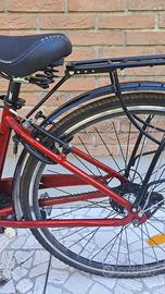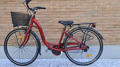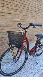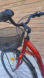 Bici da donna, ruote da 28", telaio in alluminio, cambio shimano con comando a manopola, completa di luci anteriore e posteriore, porta pacchi posteriore e cestino. Bici pari al nuovo.