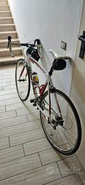 bici da strada Bianchi Via Nirone 7, un modello di bici da corsa entry-level del rinomato marchio italiano. Questo modello specifico presenta un telaio in alluminio idroformato con forcella in carbonio e inserti in Kevlar, progettato per offrire comfort ed assorbimento delle vibrazioni su lunghe distanze, cambio schimano