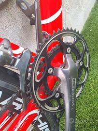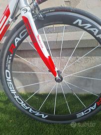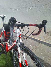 Telaio in alluminio HPA (High Performance Aluminium) ALU 7005. Cerchi in carbonio MARCHISIO RACE con pista frenante in alluminio. Cambio Ultegra 10 velocità. Freni a pinza Ultegra. Sella San Marco. vendo con i pedali. La bici cosi com'è pesa circa 8 Kg.