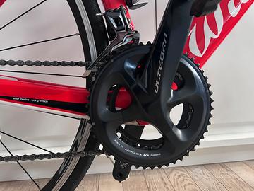 Vendo bici da corsa Modello Wilier Triestina Cento1 Air , telaio Full Carbon , Taglia XS , condizioni eccellenti , leggerissima, tenuta maniacalmente, esente da problemi meccanici o estetici. Wilier marchio storico italiano fondato nel 1906 a Bassano del Grappa, rappresenta con il modello Cento1 Air una bicicletta performante con soluzioni aerodinamiche all'avanguardia che non escludono la comodità durante l'uso. Per altre info contattatemi grazie Telaio : Wilier Cento1 Air Monoscocca Colore : Rosso Bianco con finitura Glossy - cod colore A12 Forcella: Wilier Carbon Gruppo : Shimano Ultegra Guarnitura: Shimano Ultegra 11s 50-34 MS (2x11) Pedivella: 170 cm Cambio: Shimano Ultegra 11 v Pacco Pignoni :Shimano Ultegra serie CS-R8000 Deragliatore ant: Shimano Ultegra Freni: RIM Ultegra Ruote: Shimano RS profilo 2,5 alluminio Coperture: Vittoria Zaffiro Pro 700x25C Manubrio: FSA omega per Wilier 40 cm , nastratura perfetta Attacco: Wilier by FSA da 10 cm Sella: San Marco Squadra pedali Look kèo classic Misura Tutbo orizzontale 51.3 Misura tubo obliquo sella : 46