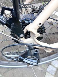 Bicicletta da trekking, city bike, cicloturismo, con forcella amortizzata, ideale per le uscite del fine settimana o come mezzo di trasporto quotidiano. Dotata di portapacchi posteriore, parafanghi, forcella amortizzata, sella con molle, luci incorporate. 24 velocità, freni a disco idraulici. La bici in pratica è nuova, ha poco tempo ed è stata usata una volta. Vendo per mancato utilizzo. Qualche dettaglio tecnico TelaioAlluminio: Lega da 28" Taglia 48 cm per una statura di 162 - 175 Taglia ruote700mm Cambio Shimano Altus Deragliatore posteriore Shimano Acera GuarnituraSignum Alloy Freno a disco Pneumatici con fianchi riflettenti, ottimi per essere visti al buio Manubrio Signum ManubrioPromax Alloy regolabile Ottimo affare per chi cerca una bici usata, ma nuova, confortevole e con pochissimi segni di uso. La bici si trova a Milano, consegna a mano. No perditempo. Prezzo non trattabile.