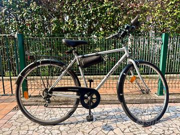 Bici da trekking LongWay da uomo grigia con cambio Shimano 5 rapporti, copertoni 700 x 35C (ETRTO 37-622), completa di parafanghi, portapacchi, campanello, cavalletto, caratifrangenti, luce anteriore e posteriore, supporto per smartphone, borsa da telaio nera.