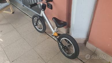 Vendesi splendida bici di equilibrio in alluminio con ruote da 12" e elastomero che ammortizza le ruote posteriori. Il nostro bimbo usandola in 6 mesi è passato alla bici a pedali senza nessun problema. Marca Kona, sellino in cuoio, sistema per bloccare il manubrio in caso si voglia andare solo dritti (bimbi picccoli), e sellino segolabile. Roma Nord prossimo a Corso Francia