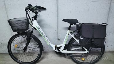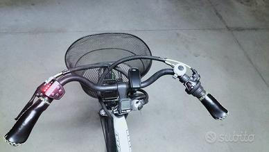 vedo bici donna elettrica per inutilizzo, usata pochissimo, tenuta molto bene, 6 marce, ammortizzatori anteriori, sella ammortizzata, borse laterali posteriori, cestino anteriore. usata una sola stagione.