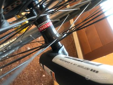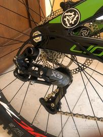 Telaio alluminio,monta freni formula C1,dischi da 203 mm,forcella doppia piastra MARZOCCHI 380 CR,mono MARZOCCHI ROCO,cerchi AMBROSIO AK26,mozzi NOVATEC con cuscinetti sigillati,gomme SCHWALBE MAGIC MARY tubeless al 70%,cambio SRAM X9,manubrio TRANZ X 6061