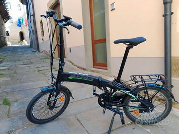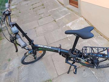 NUOVA usata solo per fare dei giri nel paese due volte per prova!!!! DA VENDERE SUBITO!!! Includero luchetto ed altro.. chiamate per info. E-folding è un eBike di Atala in alluminio, pieghevole, con ruote da 20''. E' l'ideale per muoversi con velocità nel traffico, scattante e reattiva. Una volta piegata occupa poco spazio; ha un motore Ecologic con 35 nm di spinta massima, limitata per legge a 25 km/h, batteria integrata da 313 wh che garantisce un autonomia dichiarata fino a 75 km. Freni v-brake e trasmissione Shimano a 7 velocità.