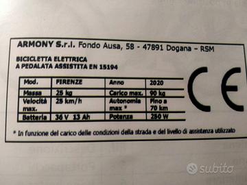 Vendo bici elettrica modello Armony, batteria nuova, sempre rimessa in garage!