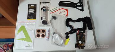 In più regalo pompa professionale, gancio per bici a parete , kit riparazione camere d'aria, un porta smartphone, un gonfia e ripara a spray, un campanello elettrico ed una borsa a bisaccia in nylon, uno specchietto retrovisore ed una catena testa nera