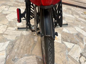 Vendo bicicletta elettrica custom prodotta da Microbike, storico produttore di bici elettriche a Roma. È una bicicletta 26” con telaio Lombardo, forcella anteriore ammortizzata con blocco ammortizzatore SR Suntour Nex, freno anteriore a disco meccanico, perno passante ruota anteriore antifurto, motore centrale Bafang da 1KW e batteria 48V 14Ah, cambio posteriore Shimano nexus integrato nel mozzo a 3 rapporti, copertoni antiforatura, sellino e pedaline per bambini di peso fino a 30Kg, display retroilluminato, controllo del limite di velocità (attualmente settato a 25Km/h) e regolazione degli step di assistenza del motore (attualmente settato su 6 livelli). Corredata da eventuale catena Kryptonite 1,5mt. Presenta alcuni segni di usura, la parte finale del parafango posteriore è monca, manca di circa 3cm. Vendo per necessità di passare a bicicletta pieghevole. La bicicletta è stata acquistata nel 2017, la scocca della batteria presenta dei graffi, è ancora in buone condizioni e revisionata in settembre. Il motore centrale, combinato con il cambio posteriore rende la bicicletta un trattore in grado di sostenere salite molto impegnative con sforzo minimo sia del motore che del ciclista. Ha rappresentato il top gamma di Microbike per appassionati, e per una città come Roma piena di salite e discese è veramente pratica. Accetto solo ritiro a mano, è possibile provarla su strada privata. No perditempo.