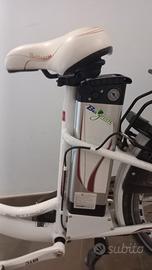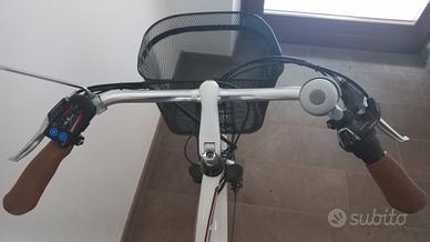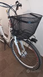 Bici elettrica da donna con cestello, porta pacchi posteriore, campanello e specchietto. Faro anteriore e posteriore. Motore elettrico con 5 velocità. Cambio meccanico a 6 rapporti.