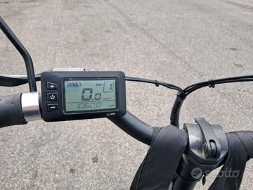 Bicicletta elettrica da 20" pieghevole, telaio in lega di alluminio, scavalco basso pratico per salire e scendere, forcella anteriore ammortizzata e regolabile, motore Watt 250, Volt 36, batteria Ampere 15 (Wh 540) con porta USB per ricarica smartphone, alimentatore a corredo, conforme al codice della strada, percorsi Km 1060 totali, sella ribaltabile per estrazione batteria, copertoni in ottimo stato, unico proprietario, marca DME, made in Italy, ulteriori caratteristiche vedere nella foto