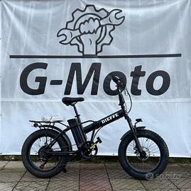 Fat Bike Dieffe 250 W Pieghevole con forcella ammortizzata Motore Posteriore 250W - Batteria 36x13AH (468wh) Al Litio - Carica Batteria Shucko 220 V - Autonomia 50/55 KM (Cicli di ricarica 500/600) Display a Led con 5 livelli di Assistenza Cambio Shimano TZ500 Manettino Shimano Revoshift 6 Velocità con ruota libera Shimano Freni con doppio disco meccanico Leve freno con switch Coperture nere 20X4,00 Manubrio in Acciaio regolabile e ripiegabile Sella City Confort Cavalletto laterale in acciaio Impianto luci a led anteriore e posteriore Portapacchi in Acciaio Parafango in acciaio.