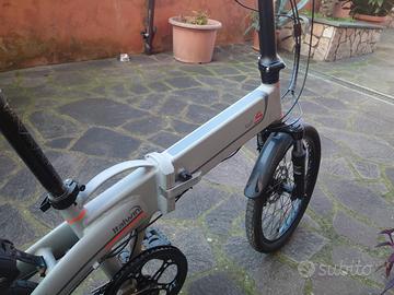Telaio pieghevole in alluminio, facilmente trasportabile. Freni a disco, forcella ammortizzata e cambio Shimano a 7 rapporti. Ruote da 20”, peso 19 kg, dimensioni piegata 90x50x70 cm.