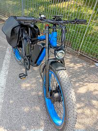 bici elettrica potentissimisima da due motori da ognuno 1000w quindi in tutto 2000w. con la batteria da 25 ah che dura con un motore 60-70km, con due motori dura 50-35km. massima velocità 50 km/h circa
