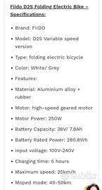 vendo bici elettrica pieghevole fido D2 come nuova per inutilizzo...comoda pratica , trasportabile in macchina cambio Shimano a 6 marce, doppi freno a disco , ammortizzatore!