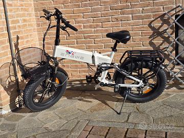 Fantastica bici elettrica, motore posteriore, motore da 250 e batteria da 624 W, a norma seconde la legislazione attuale. Cestino anteriore rimovibile (4 viti, mia applicazione, però anche il supporto si può rimuovere facilmente se non fosse desiderato). Usata poco, km attuali 1838. Selettore di potenza del motore impostato da me a 9 livelli (possibilità anche di 5 o 7 livelli). Deragliatore a 7 rapporti. Ammortizzatori anteriori e posteriori. Ruote da 20x4. Comprata 11/02/2023.