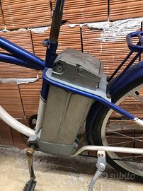 Il pacco batterie (estraibile per la ricarica a casa e bloccabile con chiave antifurto) situato sotto la sella che si alza, sono del tipo comune da 12v facilmente reperibili sul mercato a prezzi ragionavoli (sono le piombo tradizionali e non le costosissime al Litio) Fornisco caricabatteria da rete 220v