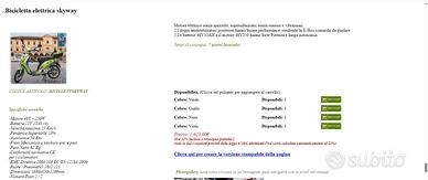 Vendo bici scooter elettrica ,con batterie nuove potenziate 48 v 20 ampere pagata 450 €, non ha bisogno di patente , assicurazione,casco ,bollo . Autonomia 50 km dipende dal peso della persona . C'è soloda cambiare il frenoa tamburo anteriore che costa 6,50 € circa ,in più c'è da cambiare il caricabatterie ,perchè quello che ho serviva per le vecchie batterie da 48v 12,5 ampere . il suoprezzodi acquisto nuovo è di 1600 € circa .fa 25 km /h come per legge e bisogna pedalare e accellerare contemporaniamente per viaggiare . é omologato per 1/2 persone. Ho il libretto . Grazie