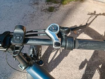 Bici elettrica pagata 1600€, in regola, con acceleratore a manubrio, freni a disco e pasticche dei freni appena sostituite, batteria nuova ancora in garanzia con solo 500km, la bici nel complesso ha circa 2600km, ammortizzatori anteriori regolabili, luci che si accendono automaticamente grazie ad un sensore di luminosità. Batteria estraibile e bici chiudibile per trasporto, 5 livelli di assistenza di pedalata, display modificabile. presenta un piccolo difetto sulla pelle della sella come da foto.