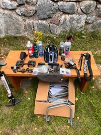 in omaggio tutte le cose nella 5* foto: muc off, casco scott con mips, 2 pompe,2 freni pastiglie galfer, guanti per bici, olio da catena, e per pulire la catena, smonta e monta catena epedali per le scarpe fatte apposta, poggia bici (ancora da montare).