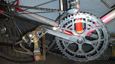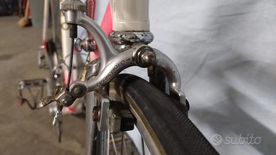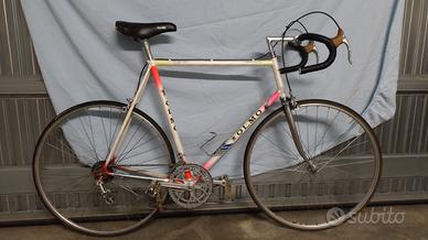 bici da corsa d'epoca OLMO COMPETITION, gruppo completo CAMPAGNOLO NUOVO GRAN SPORT 8v inclusi reggisella e portavanti (pipa manubrio) marcati OLMO, pedali e gabbiette con leve cambio e corona incisa OLMO. Sella Turbo originale. Manubrio 3T Competizione; portavanti in foto Masi attualmente montato per adattamento misura sella-manubrio. Ruote mozzi Campagnolo Record 36 fori per copertoncini, cerchi Ambrosio-Fir. Copertoncini nuovi montati. Dispongo coppia ruote cerchi NISI mozzi Campagnolo Record d'origine per tubolari. Misure centro-centro tubo orizzontale 58 cm verticale 60 cm. Disponibili altre foto. Visione e consegna a mano su Modena-Emilia Romagna. Contatto Gabriele.