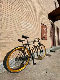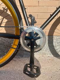 Telaio e forcella in acciaio HI-TEN, solido e confortevole. Trasmissione single speed / fixed gear con mozzo flip-flop (ruota libera o pignone fisso).
