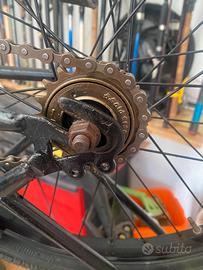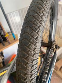 Bici particolare. Telaio comodo , ruote e sterzo bmx. Pagata 210 euro pochi anni fa. E stata ferma all’aperto e per questo ci ho cambiato negli ultimi due giorni , pneumatici come si vede , pignone e catena che erano arrugginiti e i freni. Era stata riverniciata e qualche difetto lo ha. Funziona perfettamente. Prezzo intrattabile.
