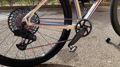 Vendesi bici gravel GT karakoram tg L, telaio alluminio e forcella in carbonio, allestimento sram gx elettronico, corona anteriore 36 T, pacco pignoni 10-52 rainbow, catena rainbow, comandi e impianto freni sram rival, reggisella e attacco manubrio in carbonio, sella prologo ndr, manubrio gravel shimano pro, ruote alluminio bontrager paradigim comp canale 25 tlr, copertoni specialized tlr 700x42. La bici è tenuta maniacalmente bene pertanto non necessita di alcun intervento e gli allestimenti descritti e’ tutta componentistica nuova. Astenersi perditempo e curiosi