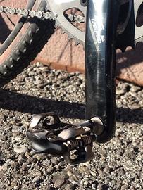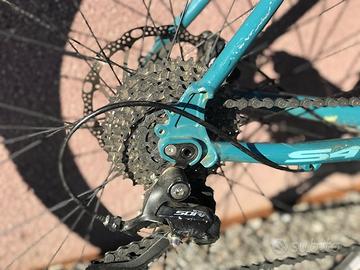 Telaio in acciaio, forcella in carbonio, trasmissione Shimano Sora 2x9, freni a disco meccanici Tektro, pedali Shimano XTR