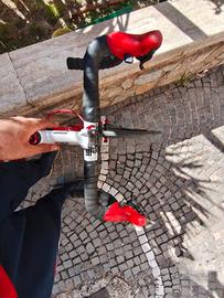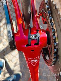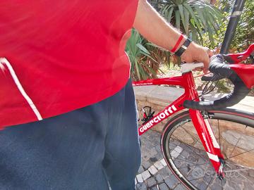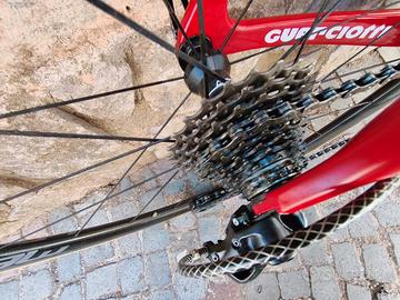 Bicicletta guerciotti con telaio in carbonio,forcella in carbonio gruppo campagnolo record,leve freni campagnolo, leve cambio campagnolo, movimento centrale campagnolo record manubrio cinelli, sellino marca selle Italia,ruote con cerchioni ad alto profilo totalmente in carbonio marca vision metron, pedivelle campagnolo in carbonio , passaggio cavi interno.