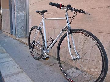 Bellissima bicicletta ibrida con telaio bici corsa Columbus in acciaio leggero (misura 55X55) con restauro professionale. Molti componenti sono nuovi di zecca (come ad esempio: manubrio, comandi, fili e cavi, pattini freni, sella, movimento centrale, pacco pignoni, catena, ruote, copertoni ecc). I pedali non sono inclusi ma darò un paio di pedali senza aggancio.