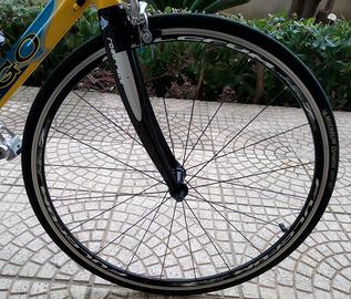 Telaio in Alluminio con forca in Carbonio "LONGO"; Cerchi 28 Fulcrum Racing 7; Gruppo Tiagra 2x10;Pinze freni Shimano XT;Manubrio in alluminio; Pedali attacco corsa Shimano; Copertoni Michelin Dinamic Sport; Sella antiprostata.