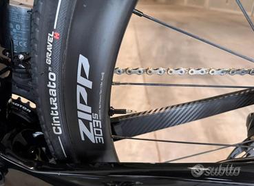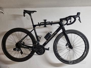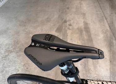 Fantastica bici full carbon con telaio no brand, monta gruppo SRAM FORCE elettronico a 12 velocità con guarnitura ROTOR dotata di misuratore di potenza integrato. Rapporti 11-34 e 50-34. Cerchi in carbonio ZIPP 303S con copertoni CONTINENTAL GP5000 (200 km, non si vedono nelle foto). Reggisella in carbonio FSA con sella PROLOGO NDR.