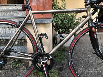 bici in titanio modello grado 9 lega di titanio 3-2,5 , modello latemar della Carraro revisionata da poco , sostituzione cavi , guarnitura , ruote ( dt swiss 1800) copertoni , catena, copri manopole , sella e pedali per un valore oltre 800€ . vendo in quanto possessore diverse bici , la bici è come nuova , il telaio in titanio eterno è tenuto perfetto senza graffi o altro , son unico proprietario . non proposte non accetto scambi e offerte il prezzo è questo pubblicato e consegno solo a mano le misure sono riportate in foto , misura M