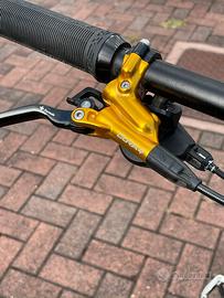 Telaio in fibra di carbonio, cambio shimano xt, sospensioni ohlins da 170. Inoltre sono stati montati i freni formula cura 4 oro.
